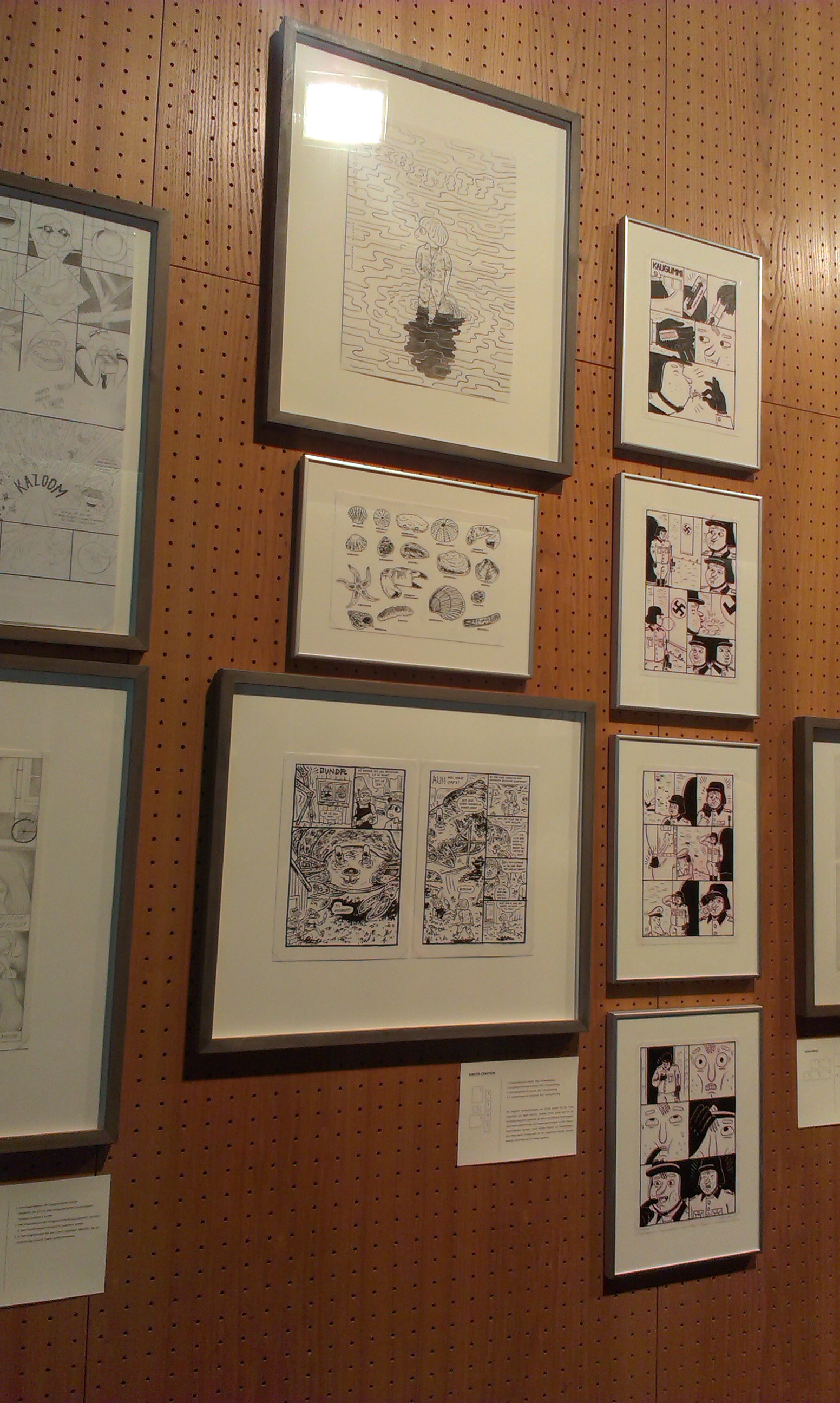 Ernstsen aus Norwegen werden präsentiert. Ernstsens ausgestellte Vorzeichnungen zeigen Szenen seines Comics “Eremitt” (2012) und die komplette Kurzgeschichte “Kaugummi” (2011). Die flächenhaften Zeichnungen, die später erst am Computer nach koloriert werden, zeugen von einer klar strukturierten Panelanordnung und bis in die Ecken bemalter Details. Besonders ansprechend sind allerdings die liebevoll gestalteten Figuren, die diese Geschichten so spannend machen.