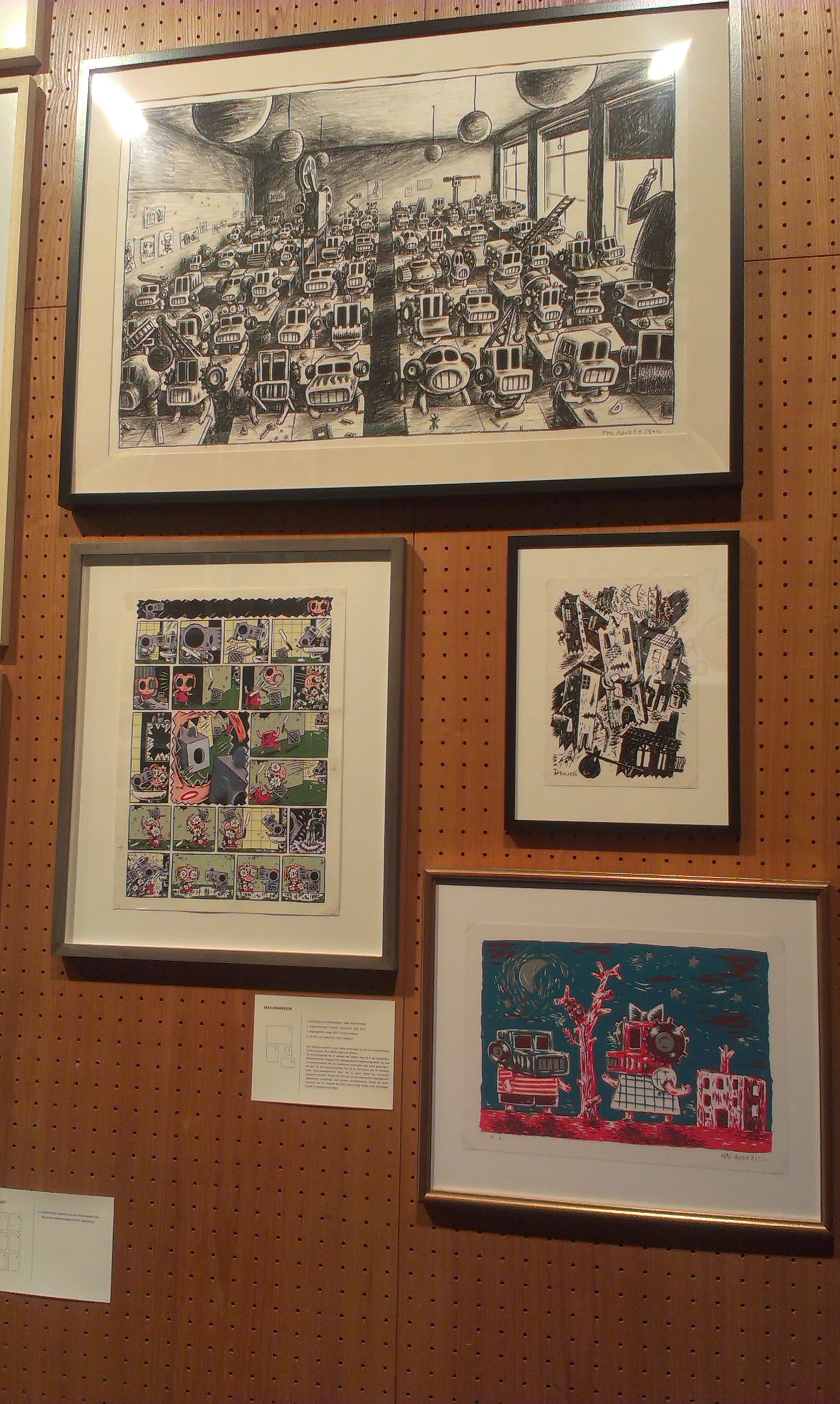 Ganz anders realisiert sind dagegen die plastischen Arbeiten von Max Andersson. In dynamischem Schwarz-Weiß oder in Farbe gestaltet, sprechen seine Bilder eine ganz eigene Sprache. Jede Seite wimmelt von grotesk gestalteten Figuren, seltsamen Gegenständen und komischem Getier, die das Lesen zu einer berauschenden Veranstaltung machen. Besonderes Highlight der Ausstellung ist jedoch ein von Andersson mit Figuren seines (Animations-)films bevölkertes mannshohes Haus. Winzige Figuren, Häuschen und Straßen können durch die Fenster des großen Holzhauses erspäht werden – ein kleiner Comic in 3D.