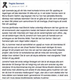 Auf der Facebook-Seite PEGIDA Danmark heißt es, dass Breiviks Attentate nicht mit islamistischen Attentaten verglichen werden könnten, da Breivik als Einzeltäter gehandelt hätte, während sich Muslime kollektiv für islamistischen Terror verantworten müssten. Unberücksichtigt bleibt dabei, dass Breivik ähnliche Thesen vertritt wie PEGIDA.