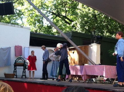 Das Freilichttheater-Panorama ist wunderbar, auch bei schlechtem Wetter. Die Schauspielerinnen und Schauspieler sind superengagiert, es wird viel und schräg gesungen und nebenher erfahren die Kinder (und vielen Erwachsenen) auch noch, wie das Bauernleben in Schweden vor 100 Jahren ausgesehen hat. Mir hat es gefallen, die vierjährige Begleitung hat die Michellieder noch am Abend gesummt – und schließlich macht ja auch ein echtes Pferd mit.