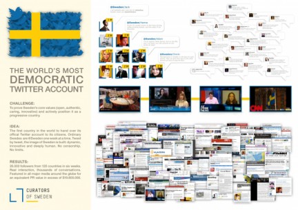 Zu letzterem gehört die Kampagne „Curators of Sweden“ um den bürgergesteuerten Twitter-Account @sweden. „Curators of Sweden“ hat zahlreiche Preise gewonnen und weltweit für Aufmerksamkeit gesorgt.